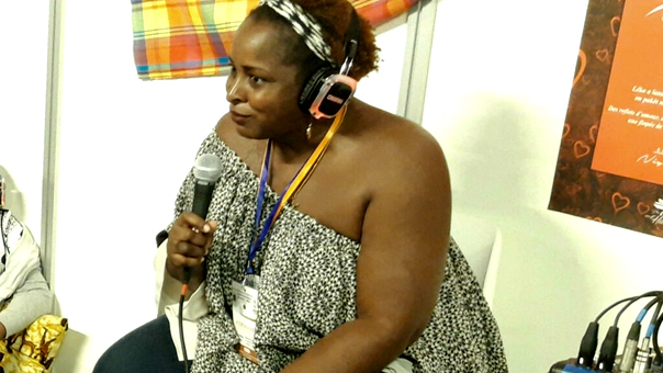 (Légende) La Guadeloupéenne Manick Siar-Titeca, directrice de la maison édition de livres audio des Caraïbes « 1 Voix 1 Histoire », à la12e édition du Salon international du livre ďAbidjan.