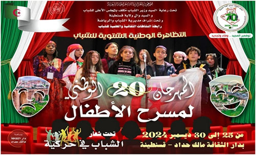 La maison de la culture « Malek Haddad » de Constantine abritera, à partir de mercredi prochain, la 20è édition du Festival national du théâtre pour enfants, a-t-on appris, lundi auprès de la Direction de la jeunesse et des sports (DJS), organisatrice de la manifestation.